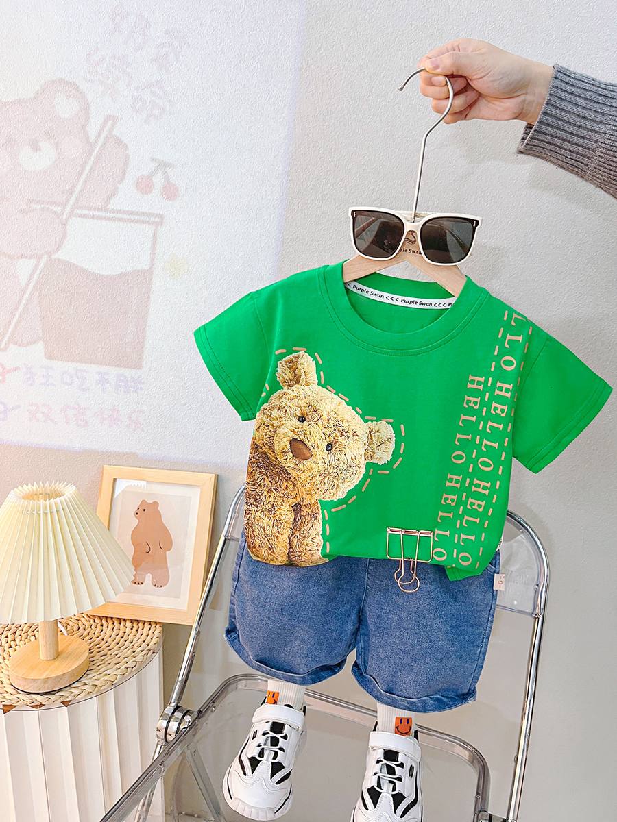 تیشرت سبز خرسی و شلوارک جین وارداتی